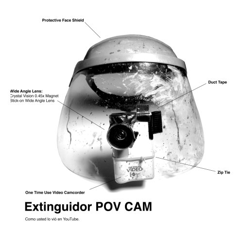 El Extinguidor POV CAM no se encuentra disponible en ninguna tienda cercana. El Extinguidor POV CAM se ensambla fácilmente usando una cámara de video reciclable -las encuentras en CVS o en Duane-Reade-, un lente angular .45x, sujetadores de cables, gaffer y un escudo de protección facial. Instrucciones aquí.